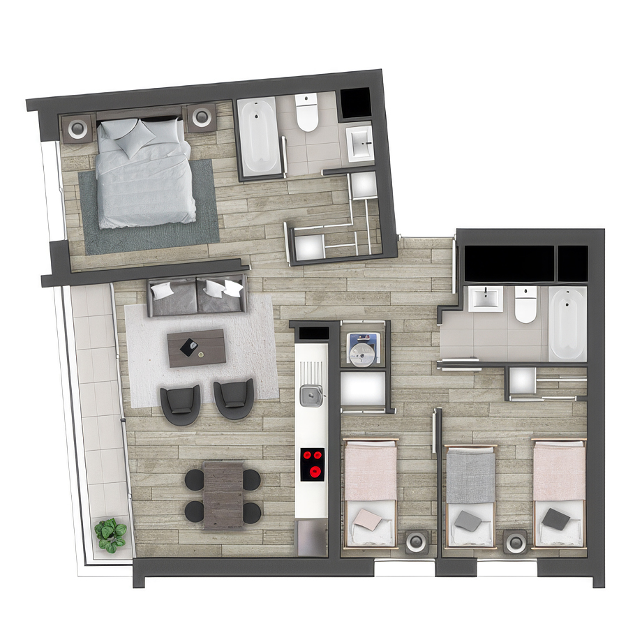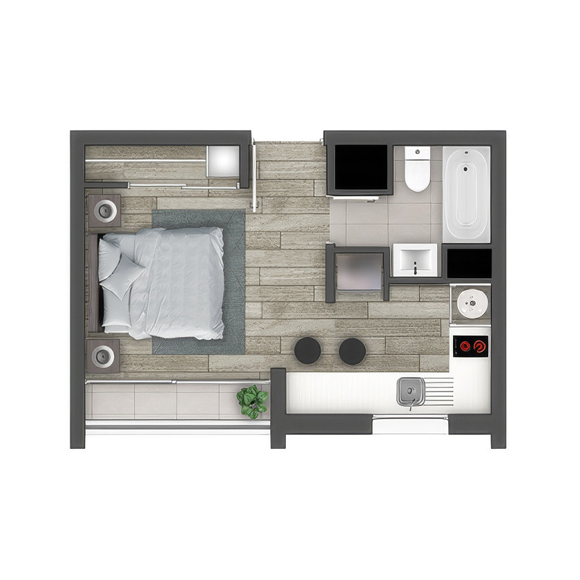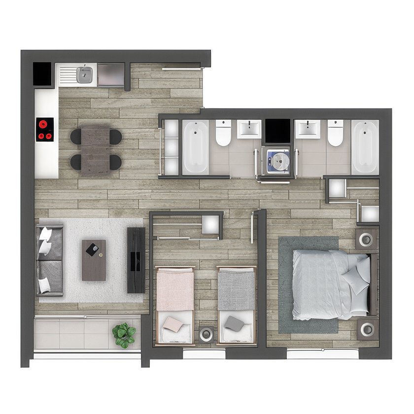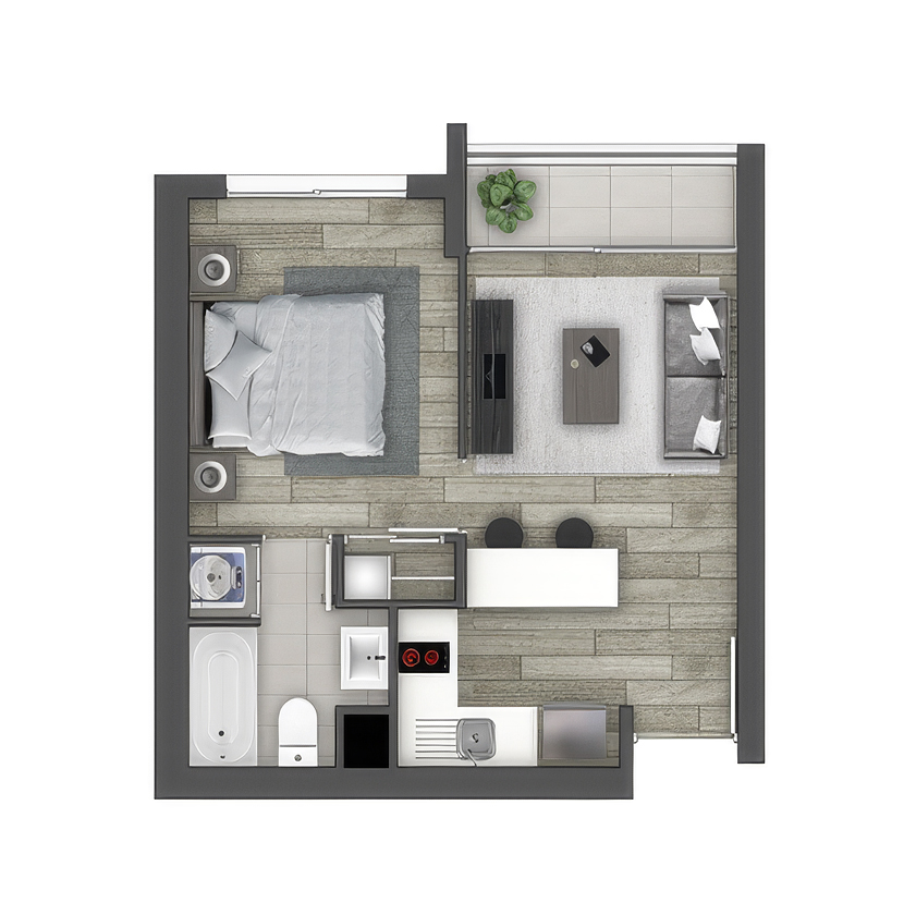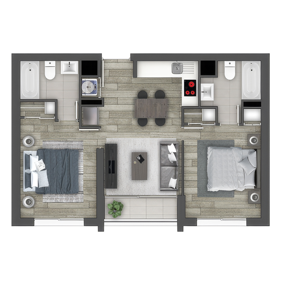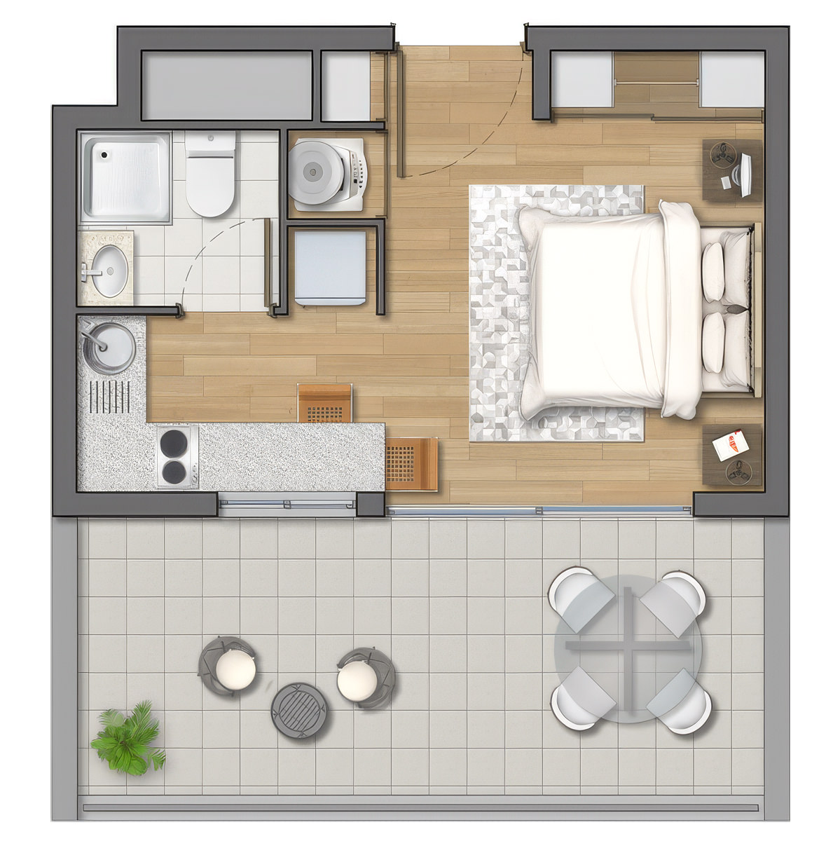 Este moderno edificio de 20 pisos ofrece 199 departamentos de 1 y 2 dormitorios con superficies que van desde 34,46 m² hasta 58,13 m² útiles, diseñados para adaptarse a tu estilo de vida. Sus terminaciones de alto estándar incluyen pisos de PVC símil madera, cocina cubierta en granito, encimera vitrocerámica, ventanas termopanel y baños con porcelanato de primera calidad.