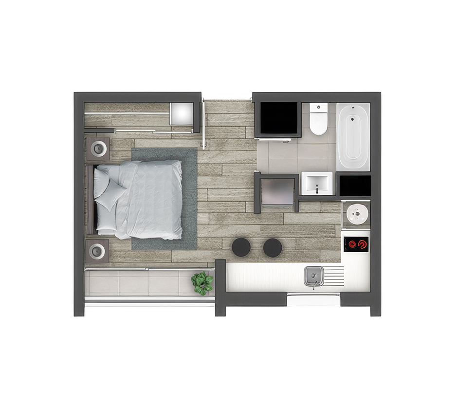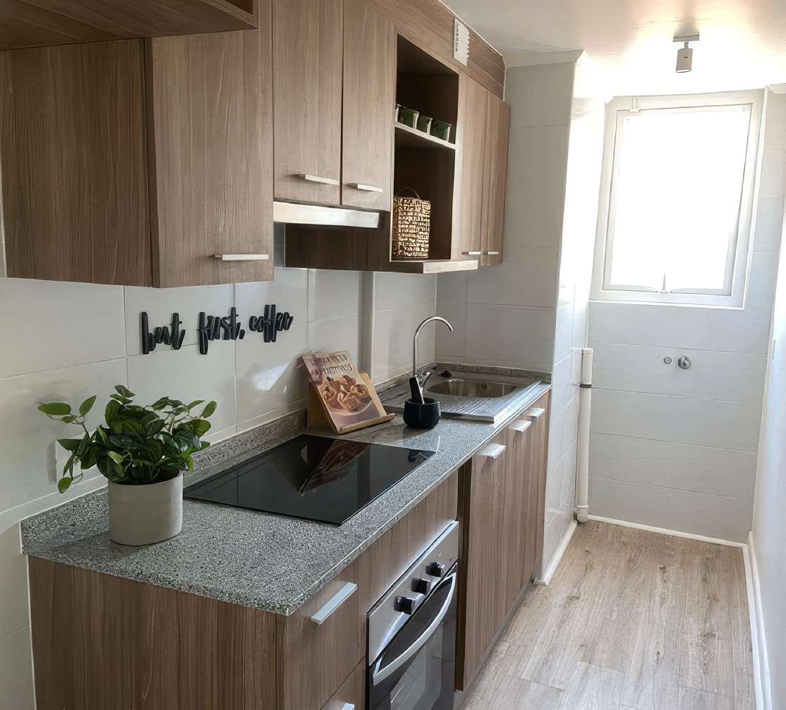 Este moderno edificio de 20 pisos ofrece 199 departamentos de 1 y 2 dormitorios con superficies que van desde 34,46 m² hasta 58,13 m² útiles, diseñados para adaptarse a tu estilo de vida. Sus terminaciones de alto estándar incluyen pisos de PVC símil madera, cocina cubierta en granito, encimera vitrocerámica, ventanas termopanel y baños con porcelanato de primera calidad.